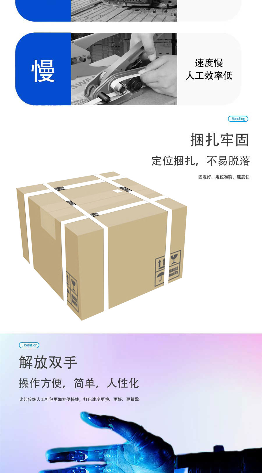 介紹:產(chǎn)品簡介: 束帶機(jī)能夠使「紙帶」或「透明膠帶」捆包,選用熱熔式粘接,產(chǎn)品捆包簡潔、美觀。也能夠跟據(jù)生產(chǎn)需要配合輸送帶,實(shí)現(xiàn)無人化捆包。 應(yīng)用行業(yè): 該款打包機(jī)廣泛應(yīng)用于醫(yī)藥、食品、日化以及其他輕工業(yè)等行業(yè)。